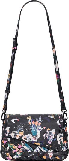 Whipstitch trim highlights the structured silhouette of this faux-leather crossbody bag in a colorful and artistic floral pattern.