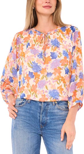 This tie-neck peasant top blooms with an allover print of colorful wildflowers, bringing instant charm to an easy silhouette. Trapunto stitching traces the neckline, while bracelet-length balloon sleeves add soft volume and movement.