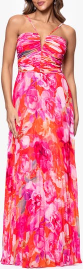 Bursting with blooms and swirled in soft pleats, this frothy chiffon gown is ready for summery soirées.