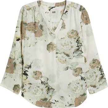 A blossom-tossed top is offered in a flowy fit and finished with a gracefully curved hemline that looks great tucked in or worn out.