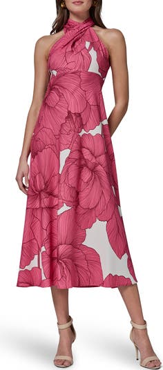 An allover floral pattern blossoms on this sunny and sophisticated A-line dress complete with a crossover neckline.