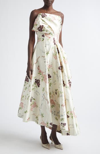 This luminous strapless gown featured on the spring '26 runway is draped from textured satin woven with metallic yarns to give the fabric a permanently crushed surface. It's crafted with an internal corset for support and descends to a full, asymmetric skirt. The trailing floral design of delicate cherry blossoms and bluebells is inspired by dresses worn by Marie Antoinette.