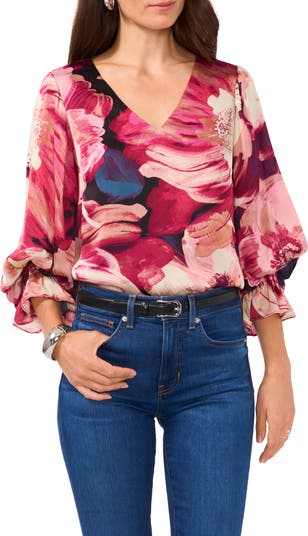 Gorgeous allover blooms romance this V-neck top framed by frill-trimmed bishop sleeves.