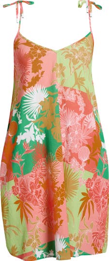 Lightweight and easy to throw on, this cover-up dress is cut from breezy crinkle cotton in a tropical floral patchwork print. Spaghetti straps tie at the shoulders for an adjustable fit, while the relaxed silhouette makes it perfect for beach days and poolside lounging.