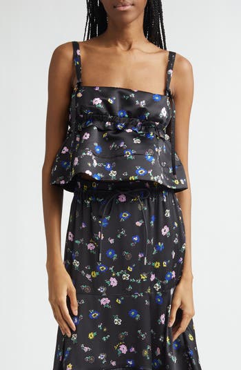 Vibrant blooms float across shimmery black satin on this ever-so-brief camisole that flares out to an undulating banded hem below the elasticized Empire waist. Tie-adjustable straps dangle their long ends front and back for a carefree look.