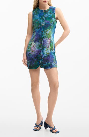 Make a casual yet refined statement in this sleeveless denim minidress in an artistic floral print.