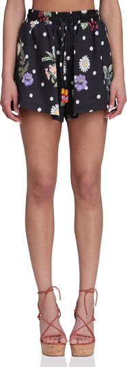 Polka dots and pretty flowers add plenty of whimsy to these smooth satin shorts complete with a beaded tassel belt.