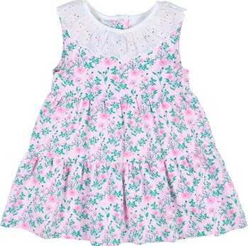 Perfectly pretty, this girls' floral print dress features a delicate eyelet collar, tiered skirt, and convenient back snaps. Crafted from soft jersey knit with gentle stretch, its exclusive floral print makes it ideal for special occasions or everyday wear.