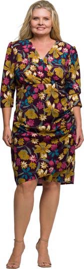 Make a statement with this bold floral print plus size faux wrap dress. Featuring a vibrant multicolor pattern on a rich base, this dress combines a flattering silhouette with standout style. The V neckline and faux wrap design highlight your figure, while the elbow length sleeves and tulip hemline create a sophisticated finish. Perfect for parties, brunch dates, or seasonal events, this dress brings a fresh pop of color to your wardrobe while keeping the same comfortable stretch fabric fit.