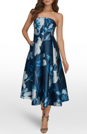 A matte satin finish gives this strapless party dress a modern, polished look, while vertical seams on the bodice create a sculpted, flattering fit. Box pleats release from the waist to form a classic fit-and-flare silhouette with crisp structure and movement. An abstract floral motif in shades of blue adds an artful, eye-catching finish.