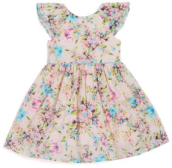 A splashy floral print further sweetens this adorable girls' dress styled with lace-tipped flutter sleeves and a blooming A-line skirt.