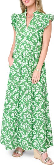 A flowery print enhances the enchantment of this breezy cotton maxi framed by fluttering sleeves and finished with flouncy frilled hem.