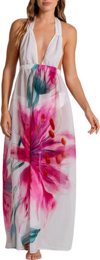 A placed floral print brings artful color to this cover-up maxi dress designed with a plunging V-neckline and ties at the neck that finish with beaded fringe. An elastic band under the bust adds comfortable shape and definition, while the long, fluid silhouette layers effortlessly over swimwear for beach and poolside wear.