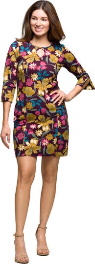 Step into effortless sophistication with this plum floral sheath dress, designed with a flattering above the knee length and tailored fit. The bold floral print adds a pop of color, while the keyhole neckline with split detail sleeves creates a polished and feminine finish. Made from a comfortable stretch fabric, this versatile dress transitions seamlessly from day to night. Pair it with heels for an elegant evening look or flats for a chic daytime outfit.
