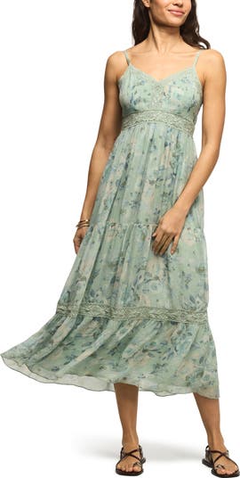 Floaty chiffon patterned with blooms brings airy romance to this lace-trimmed dress. The V-neckline and adjustable straps frame the shoulders, while a smocked back ensures a comfortable fit. A tiered skirt adds soft movement, completing the effortlessly lovely look.
