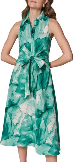 An elegant watercolor floral print brings artful intrigue to this linen-blend sleeveless midi dress styled with a spread collar and button front detailed with covered buttons. Ties at the waist define the silhouette, while the breathable fabric keeps the look polished and easy.