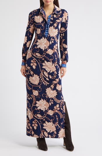 Contrast trim adds the perfect pop of color to this long-sleeve dress in a decadent floral print.