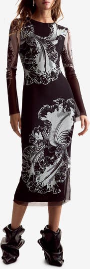 Scaled-up floral motifs make a bold statement on this streamlined midi dress complete with sheer sleeves.