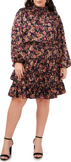 Tiered ruffles create the flouncy skirt of a statement-making dress in a delightful floral pattern.