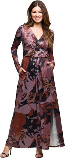Timeless and ready for any occasion, this gray floral wrap maxi dress is the perfect balance of comfort and elegance. The deep V neckline and classic wrap silhouette create a flattering shape, while the long sleeves and maxi length provide full coverage for a polished finish. A side slit adds a touch of movement and allure, making it ideal for both day and evening wear. Crafted from a soft, stretchy polyester blend, this dress ensures comfort while maintaining a sleek look.