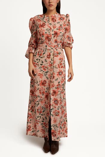 Painterly blooms romance lightweight front-button maxi framed by puff shoulders and billowy frill-trimmed sleeves.