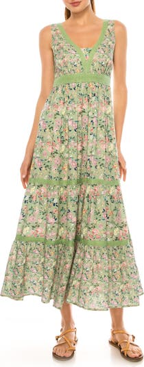 Easy and romantic, this floral-print maxi dress is designed with a fitted bodice and softly flowing skirt. Delicate lace trim highlights the neckline, waist and tiered skirt, adding texture and definition to the breezy silhouette.