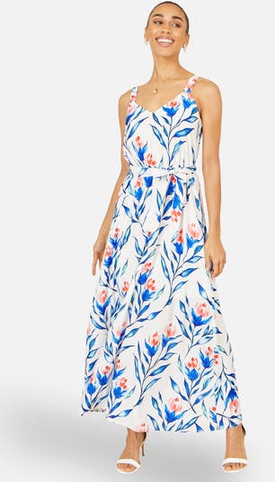 This effortlessly elegant maxi dress is a standout choice for warm, sunny days. Designed with a flattering V-neckline and wide shoulder straps, it flows beautifully into a full-length skirt that moves gracefully with every step. The bold floral print brings a fresh, summery feel, while the self-tie waist cinches the silhouette for a feminine, comfortable fit. Perfect for holidays, garden parties or relaxed summer evenings, this dress offers timeless style with ease.