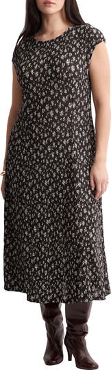 Slight dolman sleeves frame this drapey lightweight midi covered in soft texture and dainty blooms.