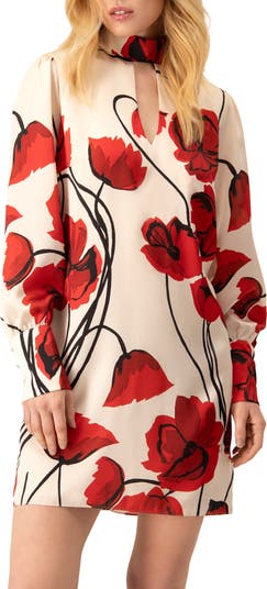 - Chic mini dress with an artistic red floral print on a natural background. Designed with a relaxed silhouette, long sleeves, and a keyhole front neckline. Features an attached high-style neck tie for an elegant and modern touch