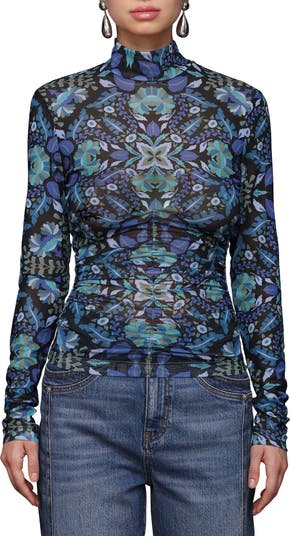A kaleidoscopic floral print makes a bold statement on this stretchy mock-neck top that's an instant retro fave.