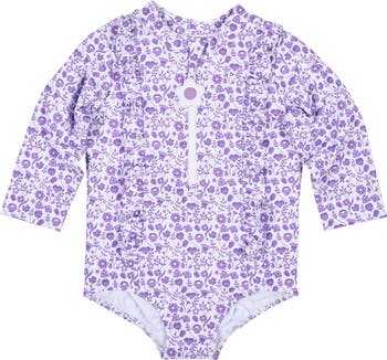 Pretty, practical, and ready for sunshine, this one-piece rashguard swimsuit features our custom purple and white floral print on a soft, stretchy nylon-spandex blend. Front ruffles add a sweet, playful touch, while an appliqué flower zipper pull brings extra charm to the easy front-zip design. Shirred back legs help the suit stay perfectly in place during swimming and play, and sizes 6M–24M include inseam snaps for quick changes. Offering both comfort and coverage, it’s the perfect choice for splash-filled days, warm-weather getaways, and sun-safe moments.
