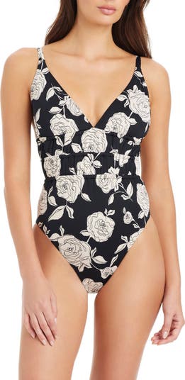 Shirring at the waist shapes this enchanting one-piece swimsuit that's covered in a chic black-and-white floral print.