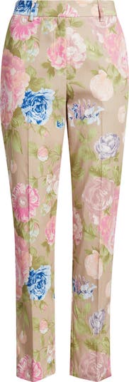 A flowery print romances these otherwise polished pants accented with vertical front creases and finished with tapered hems.