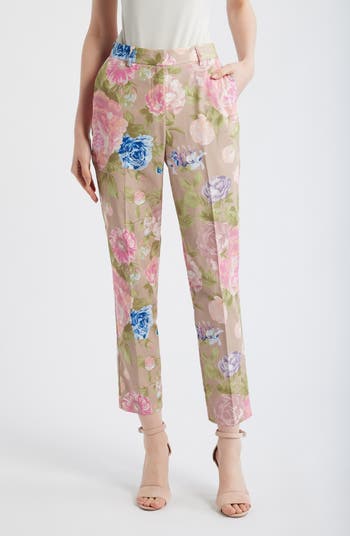A flowery print romances these otherwise polished pants accented with vertical front creases and finished with tapered hems.