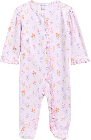 Pima cotton ensures baby will stay comfortable in this frilly floral footie secured with a front zip closure for easy changes.