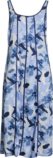 Cut from woven fabric blended with linen, this scoopneck sleeveless dress features a floral print and vertical contrast piping that runs the length of the dress, creating a paneled effect that elongates the silhouette.