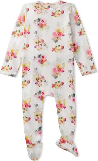 Floral prints are trending, and here's a delightful example: our charming everyday footie covered with beautiful blossoms. The silky-soft fabric blend stretches for flexible fit, while the pretty pointelle pattern adds airy, breathable comfort. Finishing touch? Convenient back snaps for quick and easy changes.