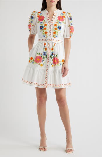 Bright and easy to wear, this cotton dress is designed with a button-front silhouette, short puff sleeves and a split neckline. A removable belt defines the waist, while the tiered skirt adds soft movement. Finished with a vibrant placed floral print and contrasting pattern at the placket and hem, it brings a cheerful, standout finish to everyday dressing.