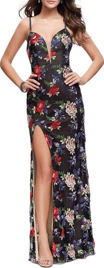 Bold floral printed form-fitting gown with a plunging sweetheart neckline. Featuring a sexy side leg slit and a strappy open back. Back zipper closure.