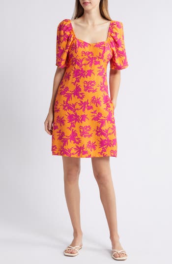 Puffed elbow-length sleeves frame this day-to-night dress designed in a lightly flared silhouette.
