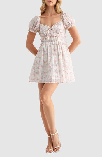 Delightful puff sleeves sweeten the silhouette of this lightweight mini covered in dainty blooms and finished with comfortable back smocking.