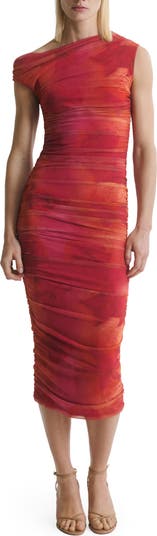 Rippled ruching and a kiss of stretch enhance the shapely silhouette of this midi made in a shoulder-showing silhouette.