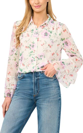 Flouncy layered cuffs romance this enchanting floral-print shirt cut from soft chiffon and framed by puff shoulders.