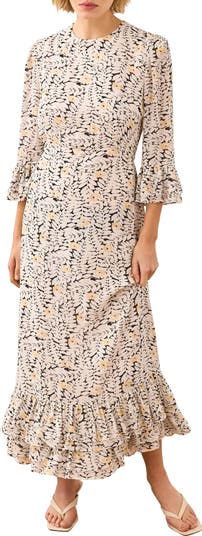 Floral print dress in a midi silhouette featuring a crew neckline, 3/4 length ruffle sleeves, tiered ruffle hemline with a zip fastening through the back.