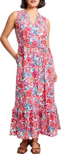Vivid wildflowers romance this sleeveless maxi designed with a defining tie belt for shape and a frilled hem for flouncy movement.