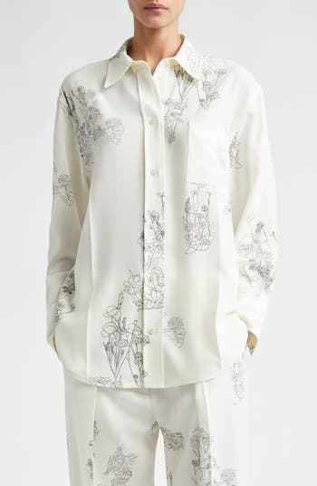 Elegance and ease coalesce in this pajama-style button-up shirt, where sketched clusters of wildflowers prettily bloom against a fluid cady canvas.