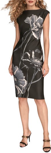 Expertly shaped from smooth, stretchy scuba-knit fabric, this floral-patterned sheath is balanced by cap sleeves and a subtle back slit for easy movement.