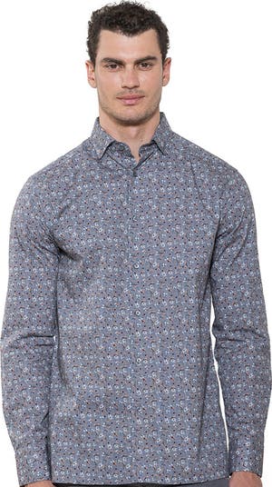 Floral printed long sleeve woven shirt with euro collar & round cuff.