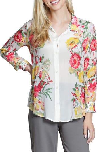 Vivid blooms romance this fluid shirt finished with a tuckable shirttail hem.
