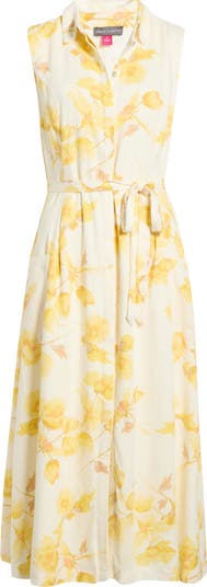 A fresh floral print softens the tailored lines of this sleeveless midi shirtdress. Cut from woven fabric blended with linen, it features a crisp spread collar and hidden placket that keep the look refined. Patch pockets add a touch of utility, while an adjustable tie at the waist defines the silhouette to your liking.